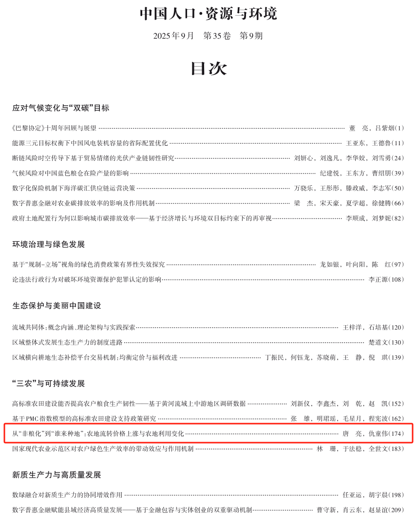 近日,永利官网青年研究员唐亮博士关于农地流转价格与农地利用关系相关研究发表在《中国人口·资源与环境》。农地流转市场化是优化农地要素配置,发展农业新质生产力的重要路径。然而,农地流转价格过快且不合理上涨正在加快农业生产成本的增加,严重影响了农业可持续发展。该研究利用2015—2023年中国家庭金融调查村庄数据,考察了农地流转价格与农地利用的关系。研究结果表明,农地流转价格与农地“非粮化”整体上具有正相关关系,但二者也存在倒“U”形关系。其原因在于,农地流转价格与农地闲置比例存在“U”形关系,即在拐点后农地闲置比例开始提高。换言之,农地流转价格的上涨在最初阶段会促进农地“非粮化”,但在达到拐点后,流转价格的持续上涨将开始加剧农地闲置,并诱发“谁来种地”的紧迫问题。进一步证据显示,农地流转价格上涨正在损害农民的种粮积极性,即农民在流转价格上涨过程中会转出农地并在剩余农地上进行多元化种植。而且,农地流转价格与农村外出务工劳动力比例呈“U”形关系,这一现象的形成原因在于,在拐点之前,新型农业经营主体对农村劳动力的农业就业具有一定的带动作用,而在拐点之后,流转价格上涨引发的农地转入主体退出和农地闲置降低了本地农业雇工需求,从而迫使农村劳动力向非农产业转移。为应对农地流转价格过度上涨引发的系统性风险,应该统筹规划补贴政策、产品价格政策和要素价格政策,并加快建设政府主导型和战略后备型农业经营体系,着力培育保障国家粮食安全和重要农产品稳定安全供给的国家队,筑牢防范农地“非粮化”和“无人种地”的最后一道防线。