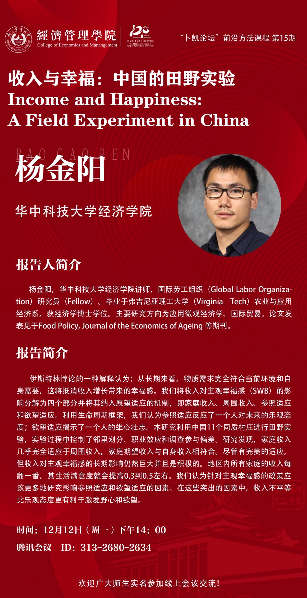 题 目:收入与幸福:中国的田野实验(Income and Happiness: A Field Experiment in China)