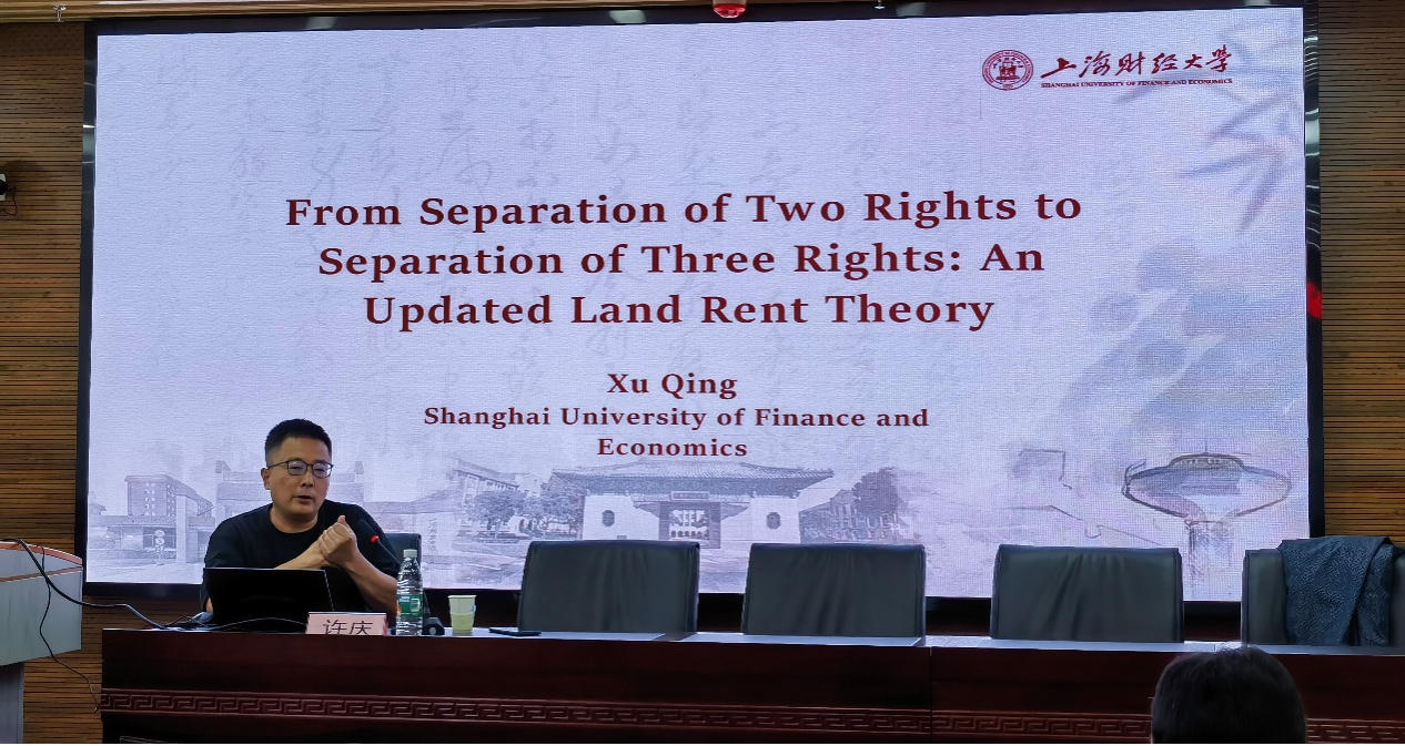 之后许教授从中华人民共和国成立以来中国土地从两权到三权的发展、地租视角进行剖析,并提出:地租在地租的产生、征收和分配过程中,从所有权的表现演变为国家意志的表达;传统的地租理论只涉及土地所有权和使用权,而目前中国的土地承包权与土地所有权相分离的两权分离的观点。