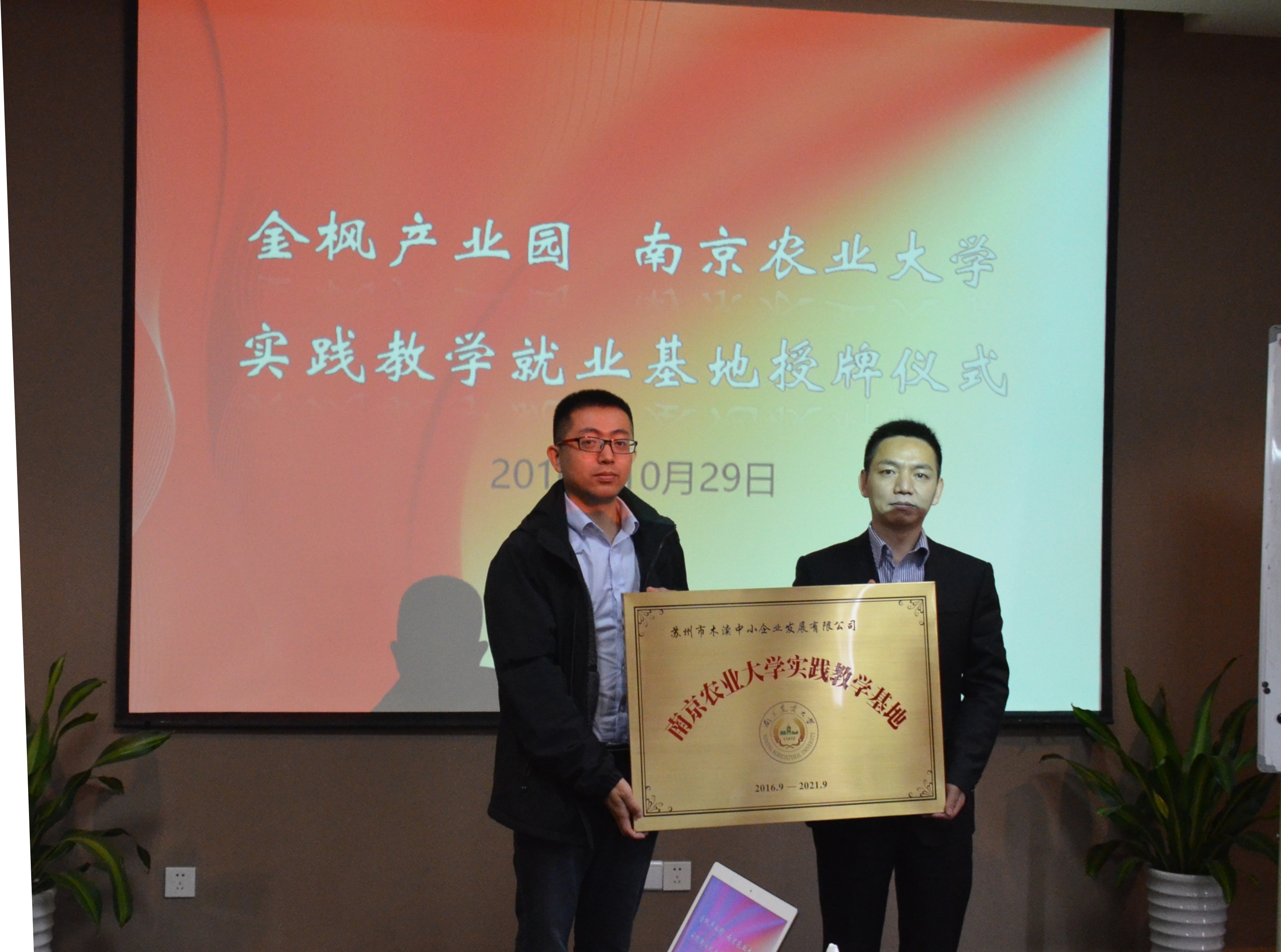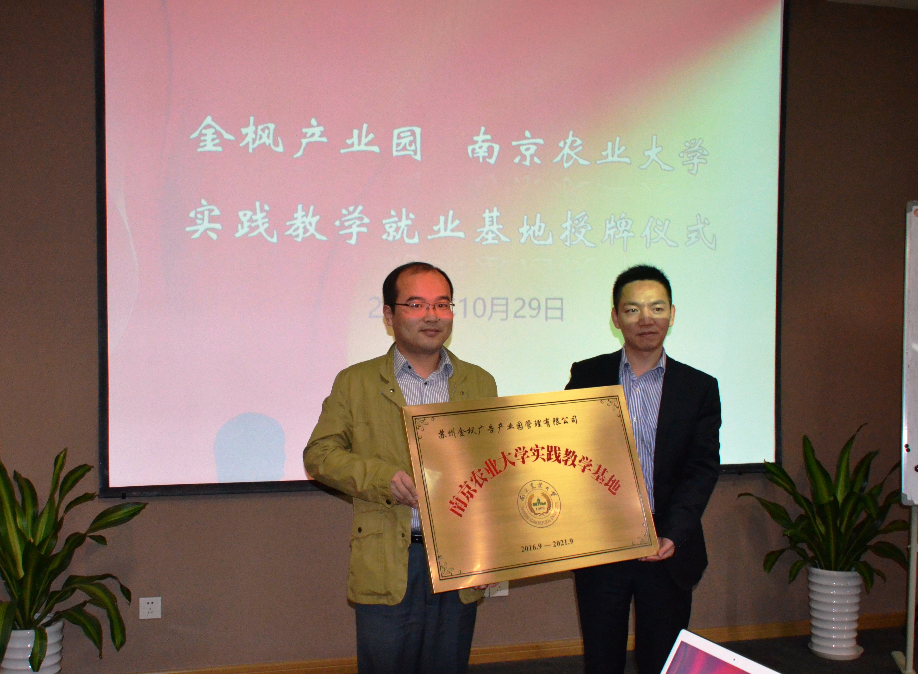 yl7703永利官网副院长林光华代表学校与金枫产业园进行了“yl7703永利官网—金枫产业园实践教学就业基地”授牌仪式,管理系系主任何军参加签约仪式。