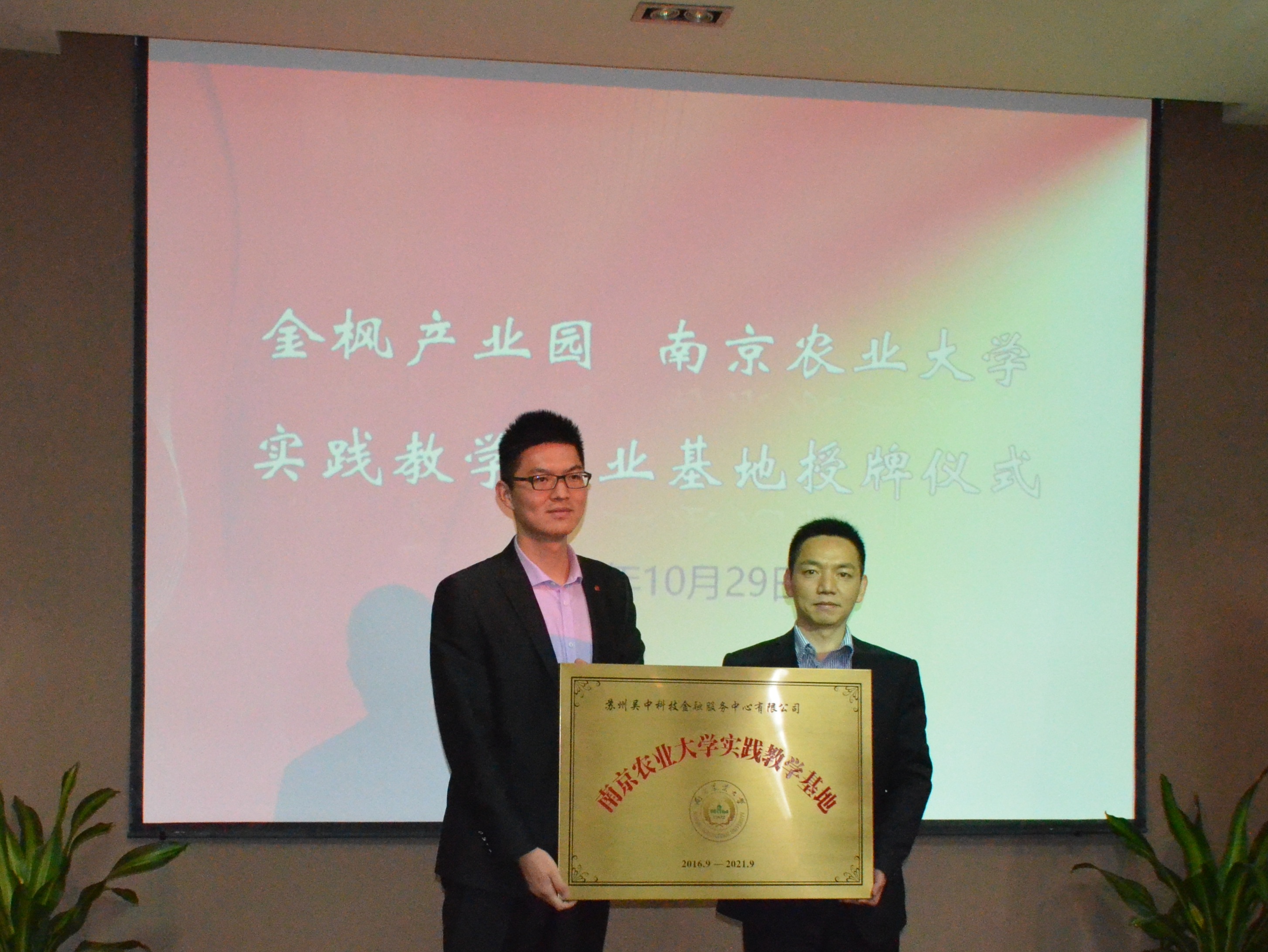 10月29日,yl7703永利官网—金枫产业园实践教学就业基地签约仪式在苏州市金枫产业园举行。yl7703永利官网副院长林光华,管理系系主任何军,管理系教师丁振强、吉小燕以及14级管理系本科生参加了授牌签约仪式。金枫创业投资有限公司总经理高新文、金枫产业园各园区负责人出席了基地签约授牌仪式。