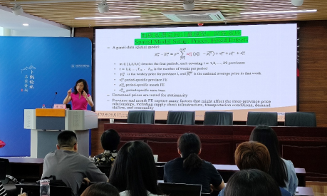 王红教授首先介绍了文章的两个理论背景:空间市场一体化及经济有效性以及冲击、市场碎片化及一体化重建。然后以中国2018年非洲猪瘟疫情下实行的禁运政策为切入点,发现禁运政策解除后市场一体化重构迟缓的现实问题,以此为背景收集了中国29个省份2016年1月至2020年11月的省级生猪每周的价格数据,向我们展示了该时段下受到冲击前后四个时期生猪价格的波动变化。接下来,王红教授详细分析了文章实证部分的公式构建和各项检验,由于29对省际数据量太过庞大还创新性地使用了高纬度空间计量模型去检验省际间价格联系的强度,并图文并茂地向我们展示了各项测算结果。