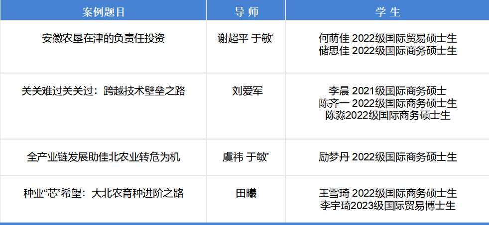 永利官网入选的4篇案例分别由谢超平副教授、刘爱军副教授、虞祎副教授与田曦教授指导。4篇案例紧密围绕我国农业企业的国际化模式开展了深入研究,充分体现了永利官网国际商务专业的特色与优势,是永利官网国际商务专业人才培养的重要阶段性成果。