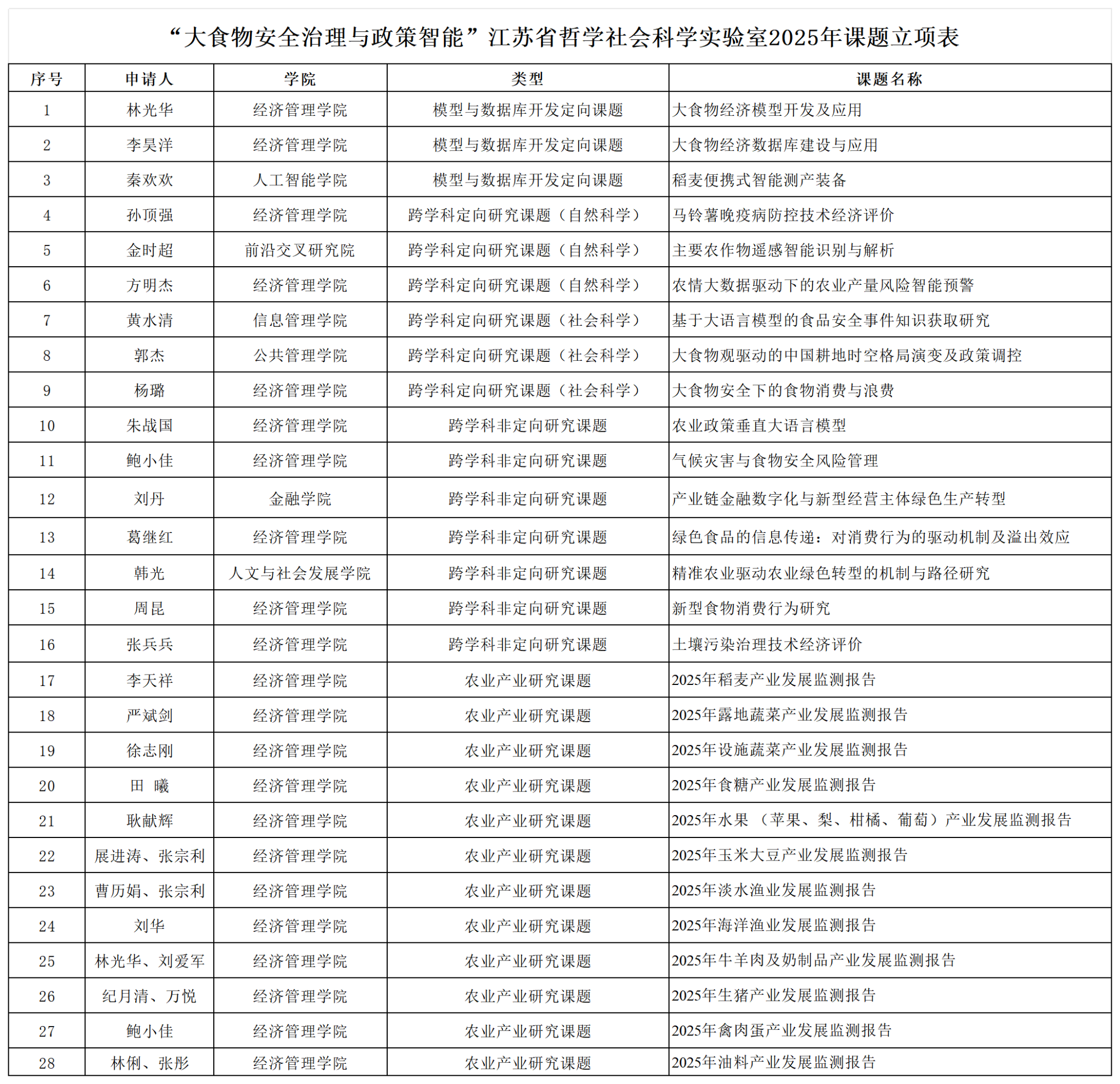本年度招标课题共吸引了来自yl7703永利官网、人工智能学院、前沿交叉研究院、信息管理学院、公共管理学院、金融学院、人文与社会发展学院等多个院系的31位申请人参与申报,研究领域涵盖了大食物模型开发、数据库构建、跨学科研究、农业产业研究等多个方向,充分体现了实验室跨学科交叉合作的宗旨和特色,更将为yl7703永利官网省文科实验室建设开局之年奠定扎实基础。