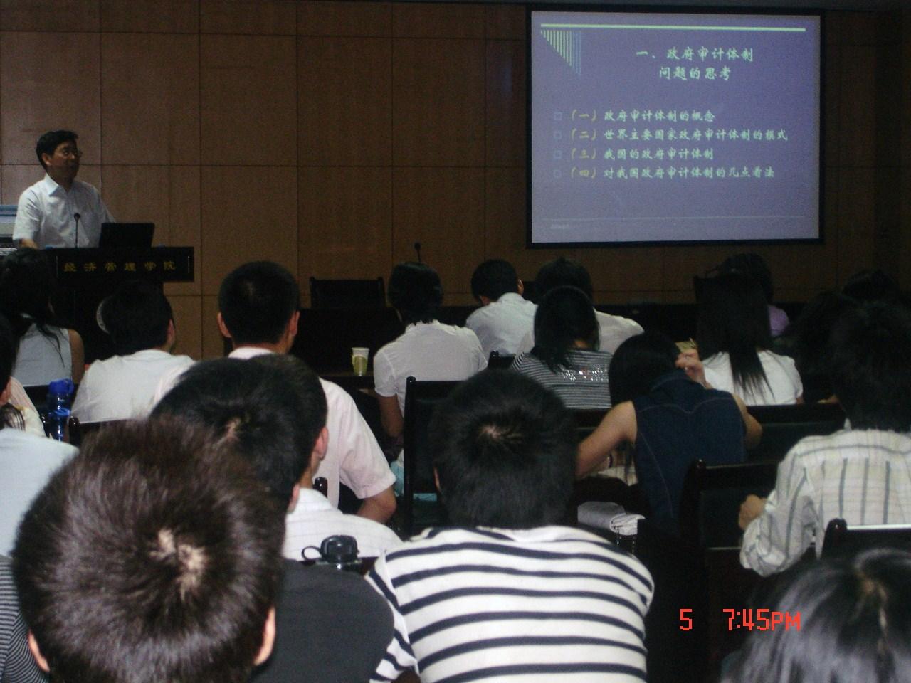 6月5日(星期四)晚上七点半,在经管院研究生报告厅,国家审计署、政策法规司王秀明司长做了政府审计若干问题思考的学术报告。对于政府审计的问题,王司长从国际讲到国内,从中国的过去讲到现在并展望未来提出了自己对中国审计体制的观点和看法;重点强调了政府审计质量控制的重要性,并把政府审计质量控制作为政府审计的两条生命线之一。由王怀明教授主持本次报告,并作了完整的总结;董晓林副教授参加了本次报告会。