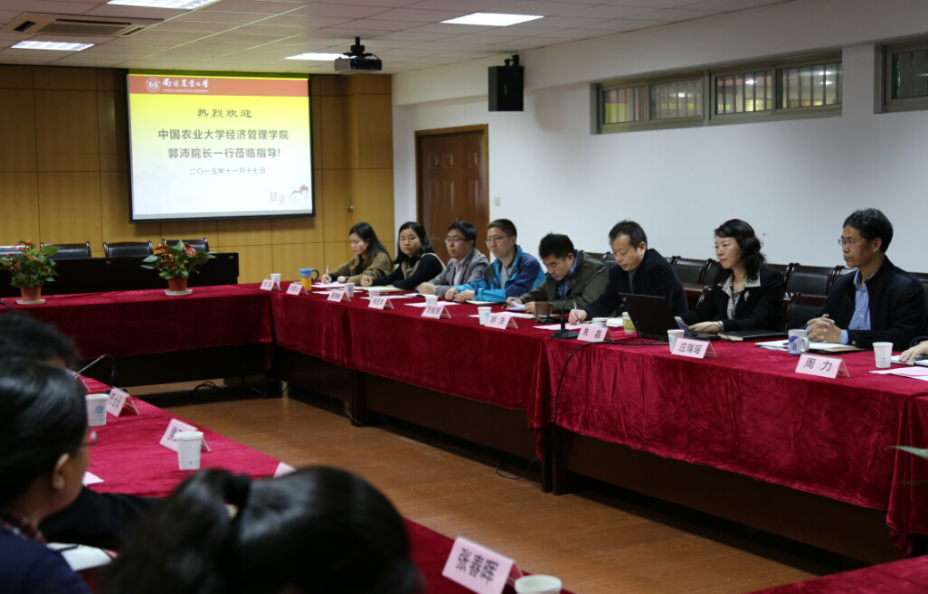 11月17日,中国农业大学yl7703永利官网院长郭沛,副院长任金政、杨欣,工商管理系系主任侯云先等一行来学院座谈交流。永利官网院长朱晶,院党委书记胡浩,副院长应瑞瑶、耿献辉,管理系主任何军、青年教师代表以及学院行政相关人员参加了交流。金融学院副院长周月书,金融学院教授王怀明应邀参加座谈。
