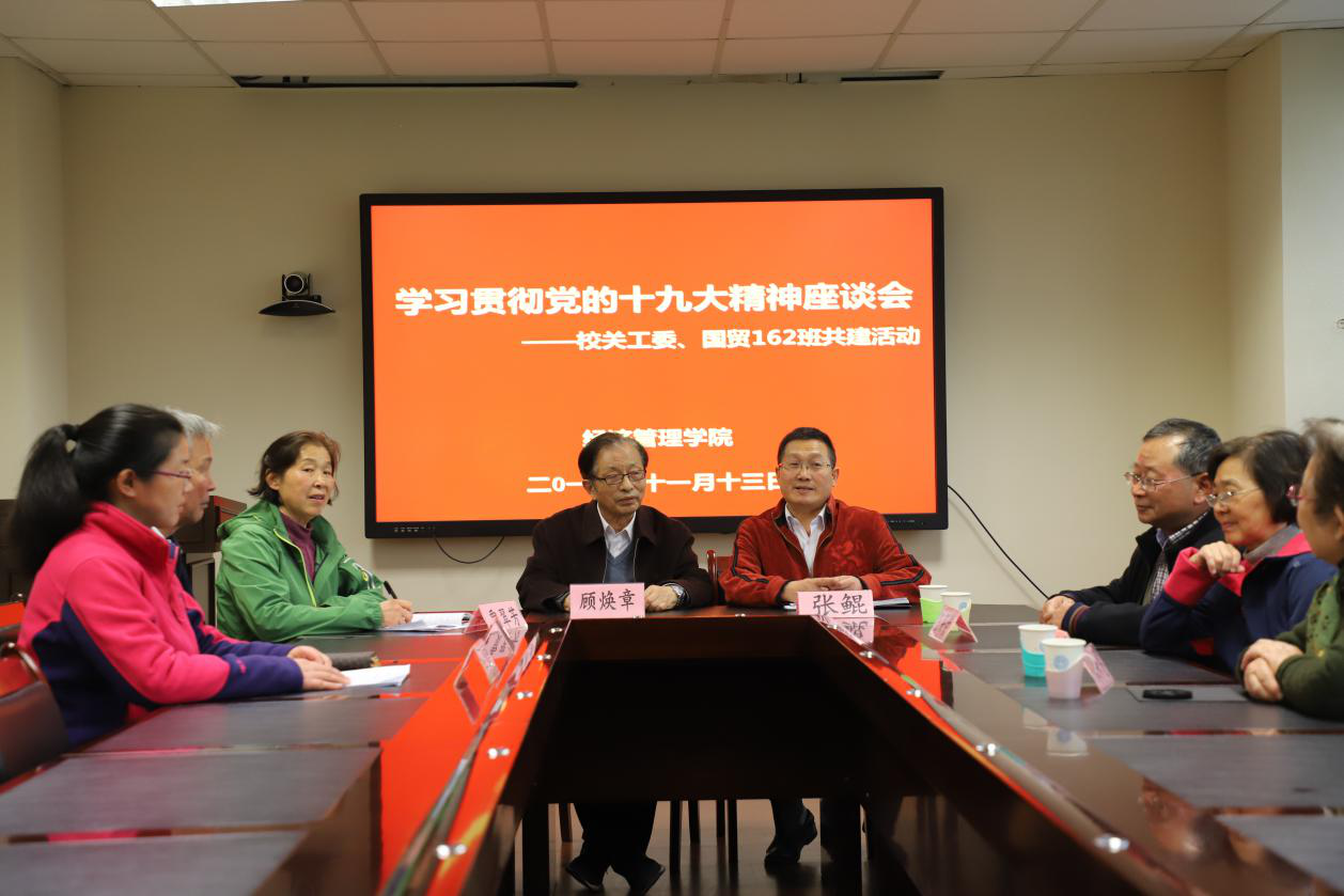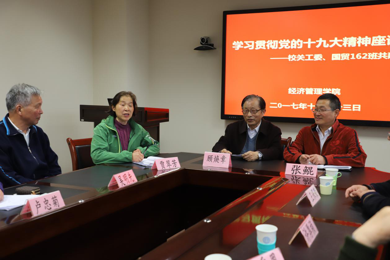 11月13日下午,yl7703永利官网“贯彻落实党的十九大”座谈会在逸夫楼5046举行。校关工委副主任贾翠芳,校关工委秘书长张鲲,经管院关工委常务副主任顾焕章,校关工委老师米秀恩、王保荣、许厚祯、吴明先出席座谈会。国贸162全体学生到场聆听此次座谈会。会议由经管学院党委副书记、关工委主任卢忠菊主持。