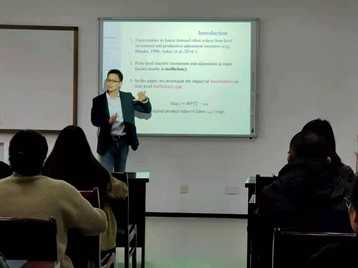 2020年11月19日上午,由yl7703永利官网yl7703永利官网主办的“国际贸易学前沿”讲座在第三实验楼1110教室顺利举行。南京财经大学国际贸易学院副教授谭用为永利官网师生作了一场名为《Uncertainty, Labor Adjustment Costs and Firm-level Inefficiency Gap》的学术报告。此次报告由院长朱晶教授主持。