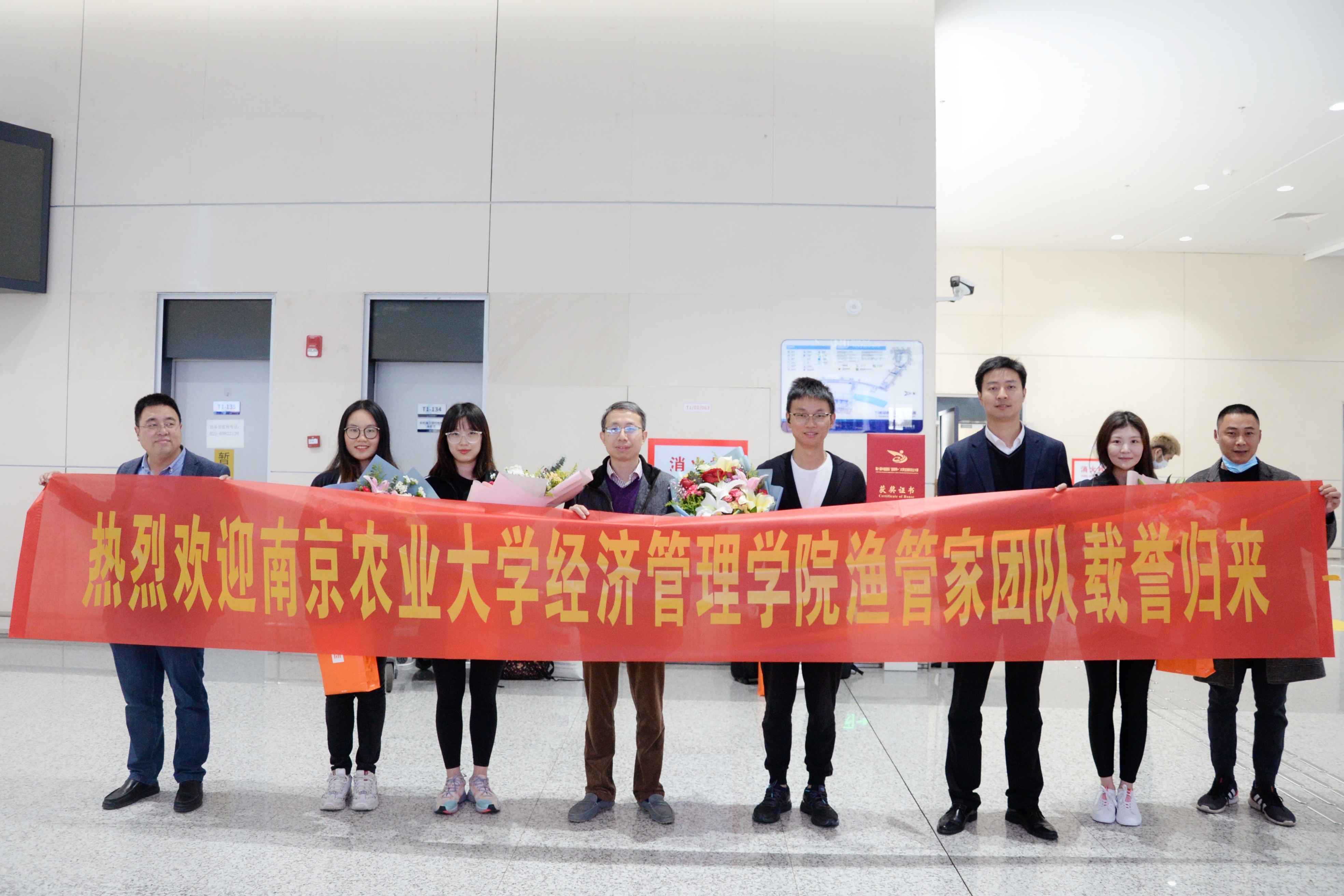 11月20日,永利官网渔管家团队乘坐着广州直达南京的航班载誉归来。学校团委书记谭智赟、学院党委书记姜海、副书记宋俊峰一行4人前往南京禄口机场接机,并向获奖团队表示热烈祝贺。