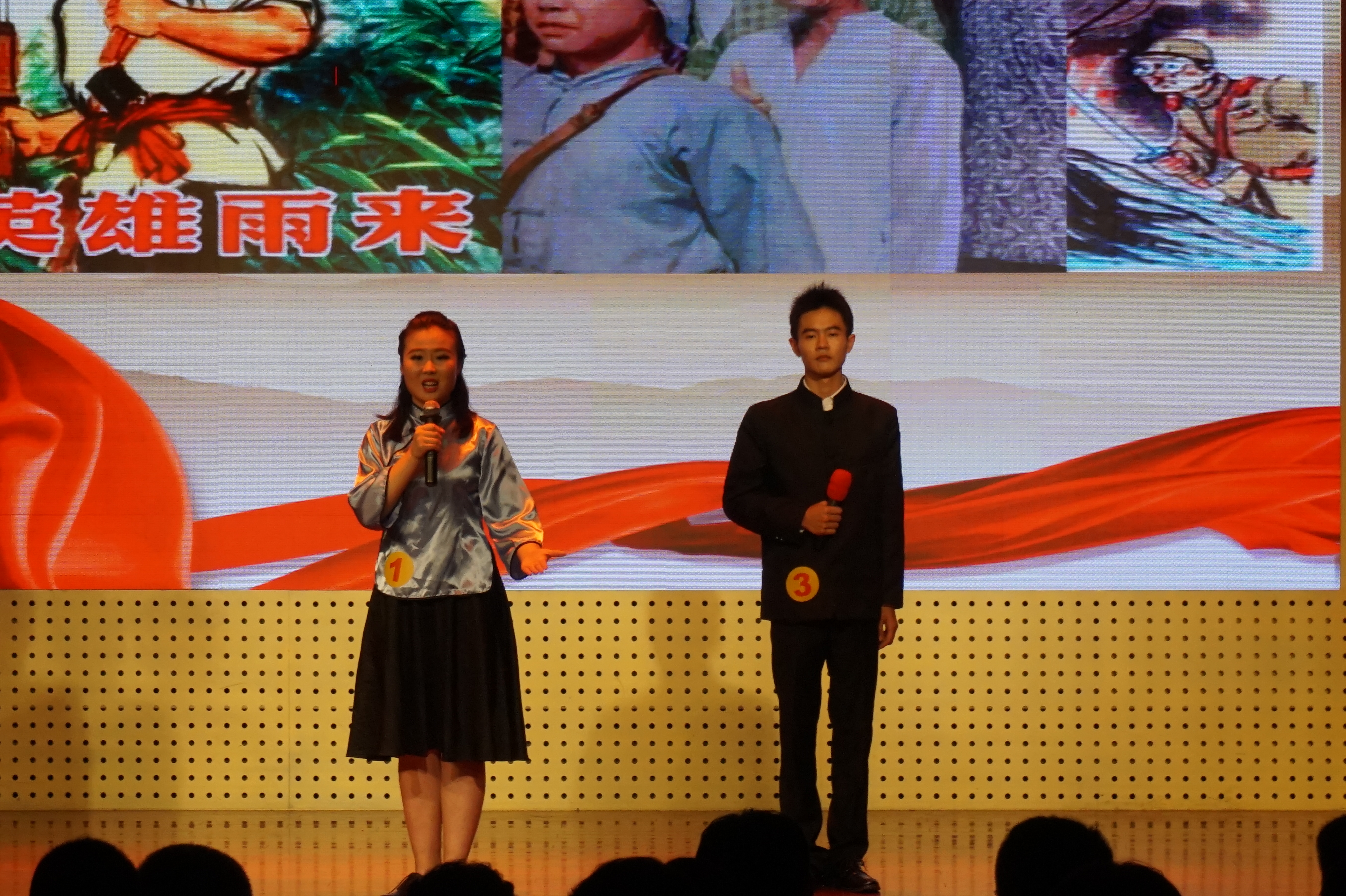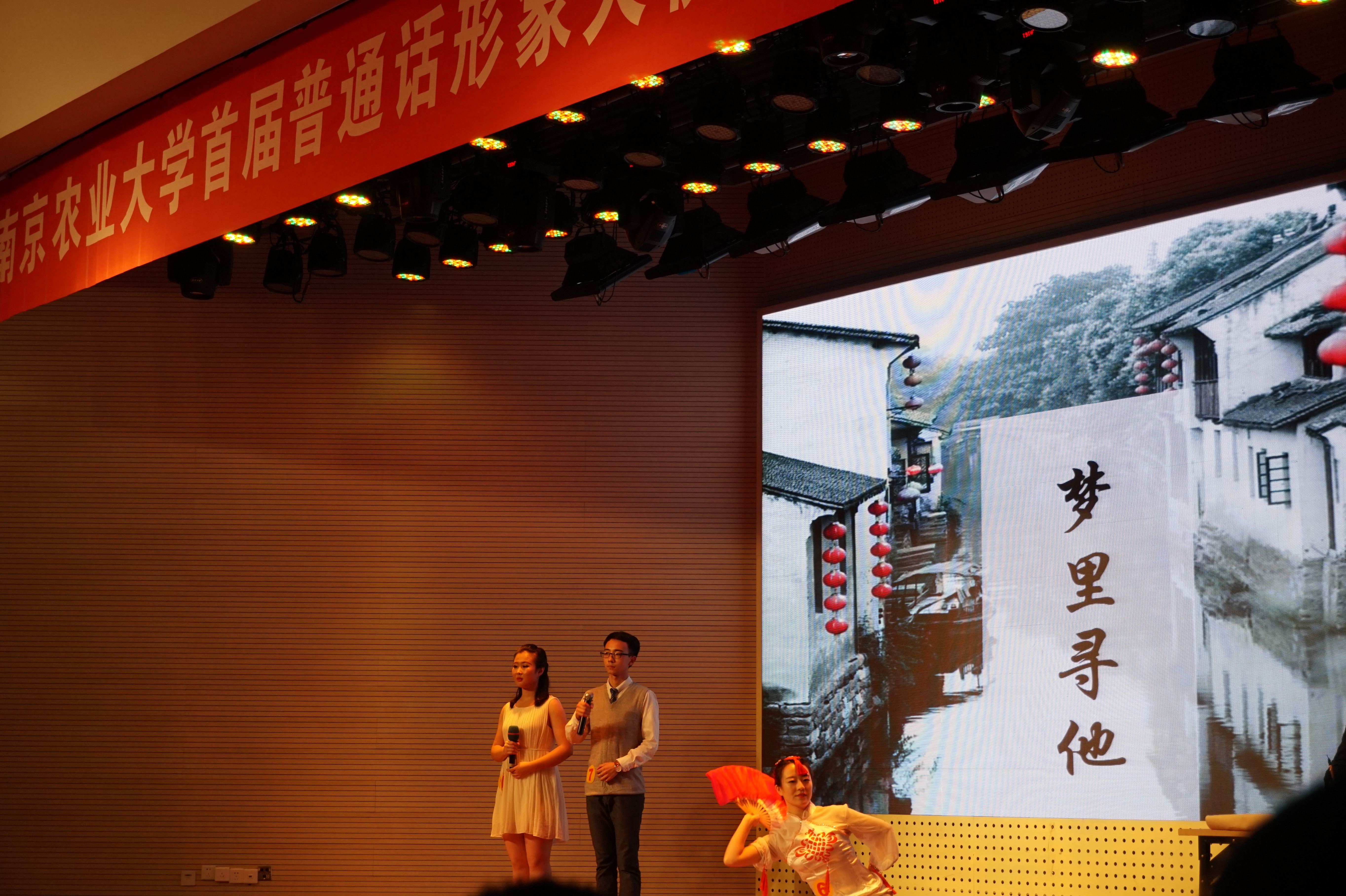 2015年9月23日晚,yl7703永利官网首届普通话形象大使选拔决赛在大学生活动中心举行, 永利官网有一名选手经过初赛和复赛的激烈角逐进入决赛,最终获得最佳人气奖。活动分为三个环节,第一环节是选手的个人展示,先是分组朗诵不同主题的诗篇,再进行看图即兴演讲,最后是对留学生进行一句话的中文教学。图为永利官网选手进行第一环节的个人展示。