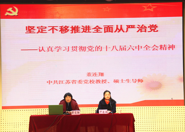 董教授从聚焦“全面从严治党”的里程碑、聚焦“全面从严治党”的新部署、聚焦“全面从严治党”的新要求三个方面向与会人员详尽阐述了学习和贯彻党的十八届六中全会精神的意义、内涵和要求。报告精彩生动、掌声不断。